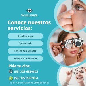 En Ocuclinika, te invitamos a conocer nuestros servicios de oftalmología, optometría, lentes de contacto y reparación de gafas. agenda tu cita al 322 235 7884.